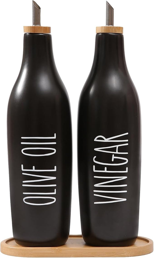 HOMCDALY Olive Oil and Vinegar Dispenser Set, Ceramic Oil and Vinegar Bottles with Bamboo Tray, 16.9oz Kitchen Cruet - Set of 2 - Black