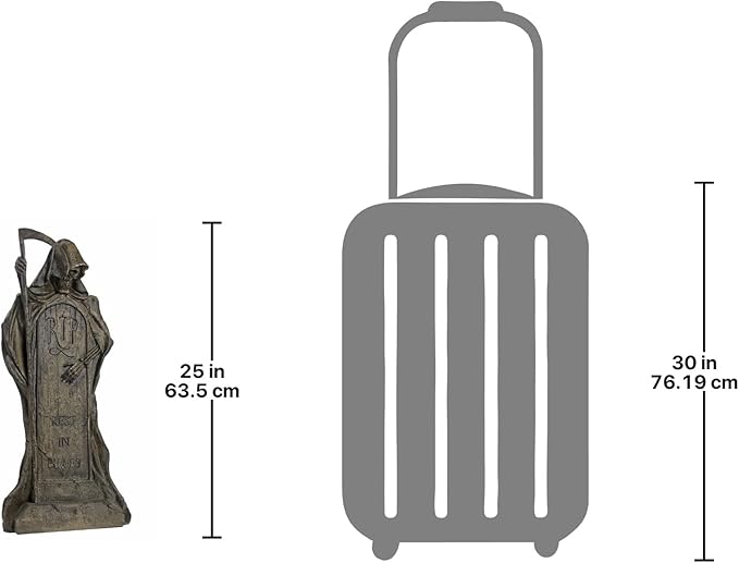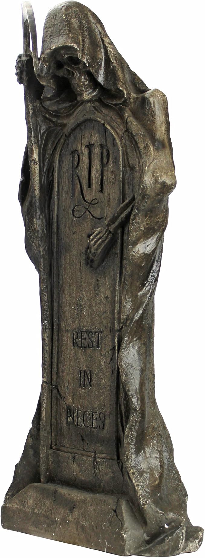 - GRIM REAPER TOMBSTONE STATUE is a grim reminder that's more trick than treat! Greet guests with a ghoul hovering over the grave with a scythe in his bony hands.
