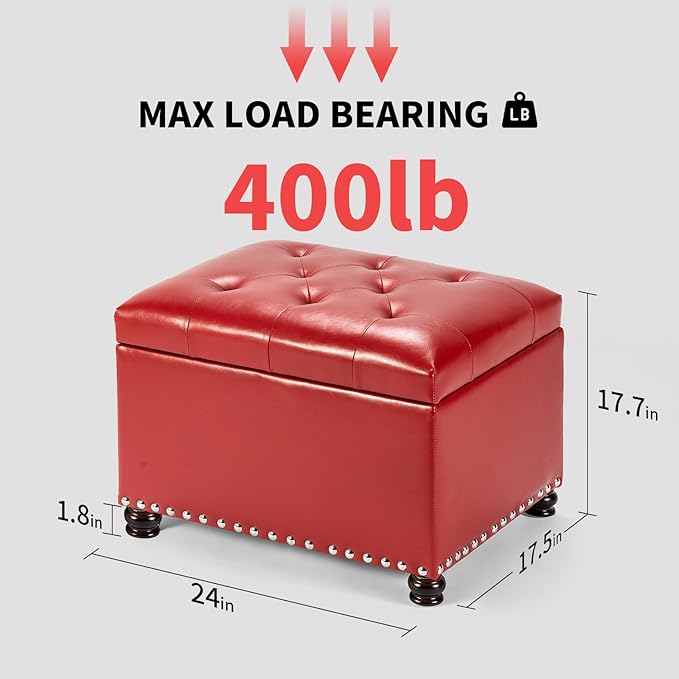 Joveco Leather Storage Ottoman, 24" Rectangle Square Bench Foot Rest Stool for Bedroom Living Room, Red