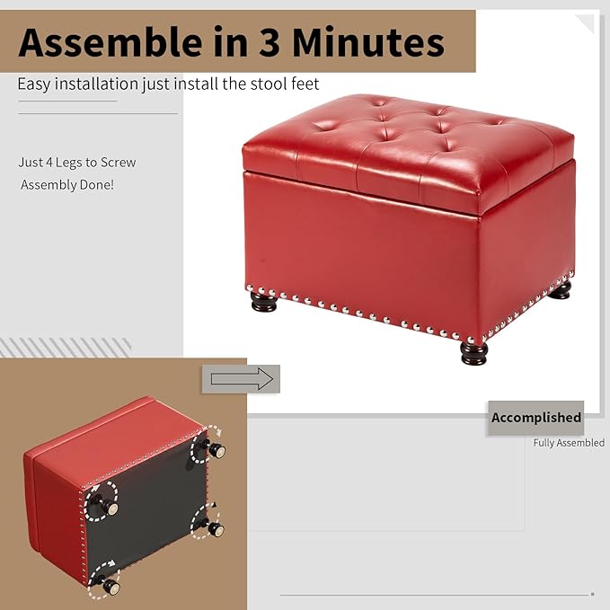 - STORAGE OTTOMAN DIMENSIONS: 24.21"L x 18.11"W x 17.71"H; Interior Size: 21"L x 14.5"W x 12.5"H. You just need to screw the legs on.(5 minutes). Perfect ottoman with storage to save more space for your room.