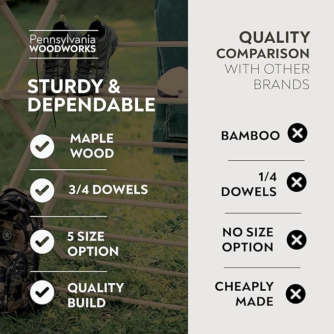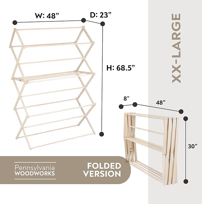 Pennsylvania Woodworks Clothes Drying Rack: Solid Maple Hard Wood Laundry Rack for Blankets, Towels, Bedding & More, Heavy Duty Folding Drying Rack, Made in USA, No Assembly Needed, XXLarge