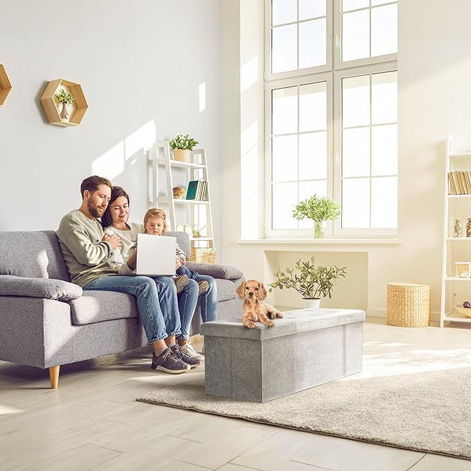 - LARGE SUEDE STORAGE BENCH (GRAY) — Add storage and seating with a beautiful rectangular shaped folding bench, perfect for storing a variety of items— Tuck away linens, games, books, blankets, accessories, and more to maximize your space with contemporary style