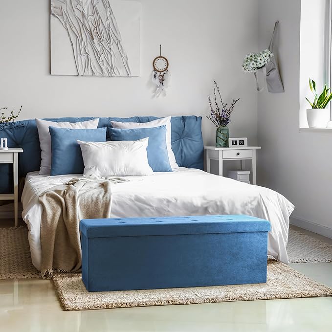 - LARGE SUEDE STORAGE BENCH (TEAL) — Add storage and seating with a beautiful rectangular shaped folding bench, perfect for storing a variety of items— Tuck away linens, games, books, blankets, accessories, and more to maximize your space with contemporary style