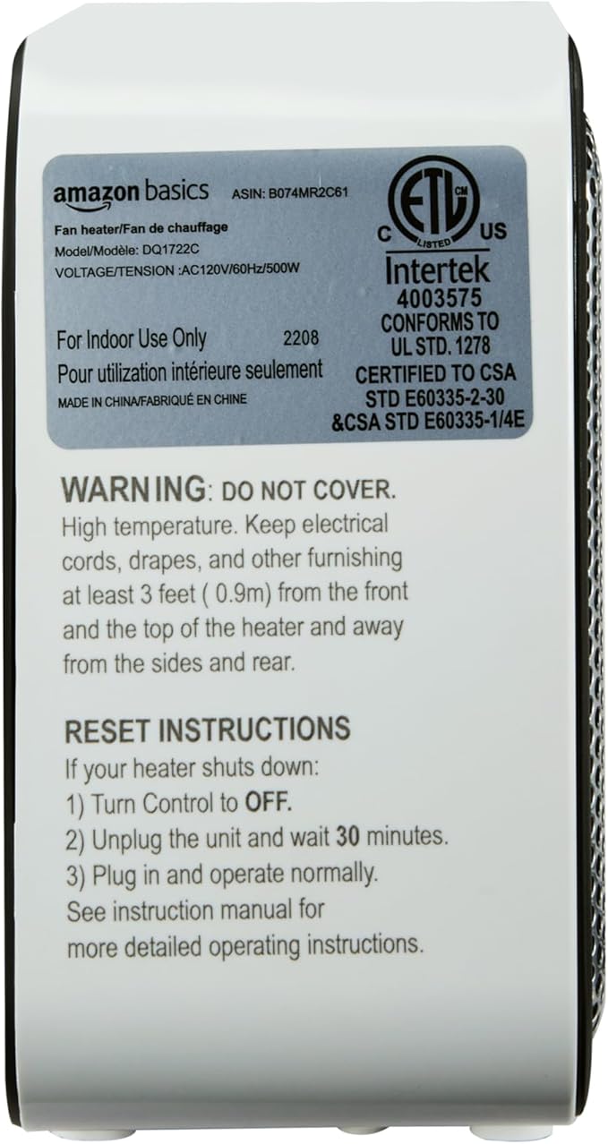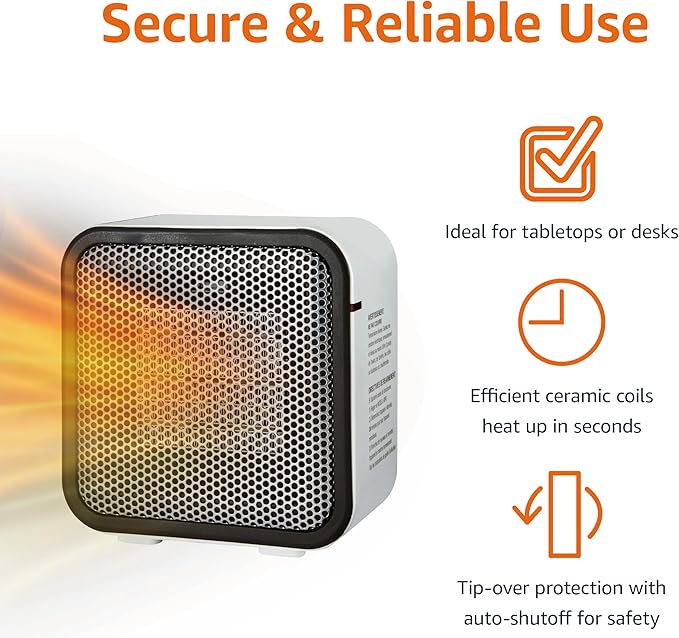 Amazon Basics Ceramic Space Heater, Mini Heater for Office Desk, 500 W, Portable Tent Heater for Camping (Indoor Use), With Tip-Over Protection, Lightweight (1.4 LBS), White, 5.9 x 3.2 x 6 inches