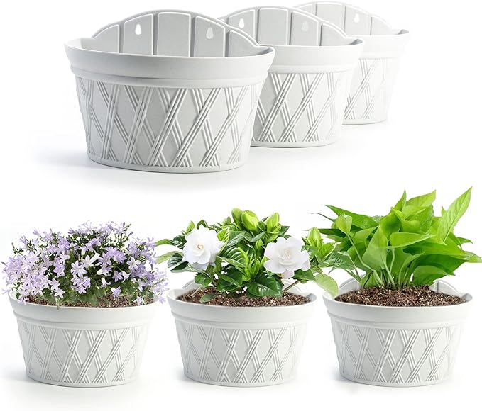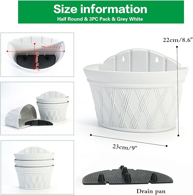 Sungmor Wall Hanging Planters,11.5 Inch Hanging Flower Pots for Railing Fence - Indoor Outdoor Balcony Wall Hanging Basket, Plastic Plant Pot Container - Half Round & 3PC Pack & Grey White