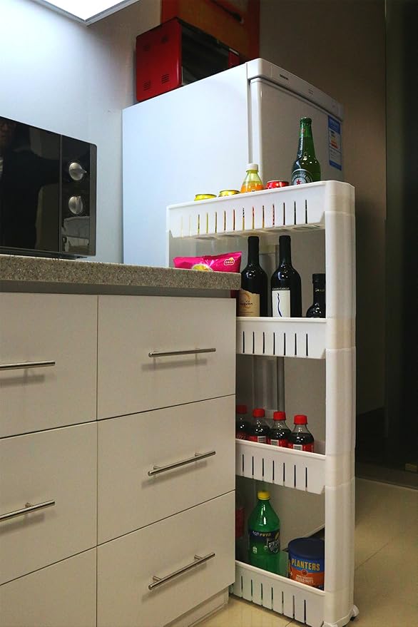 - CREATE ADDITIONAL STORAGE SPACE EASILY – This 4-tiered shelving unit organizer can be used ANYWHERE. The slim storage rack’s 4.75” design can fit an almost any narrow space. Ideal for closets, kitchens, bathrooms, garages, laundry rooms in homes, apartments and even offices.