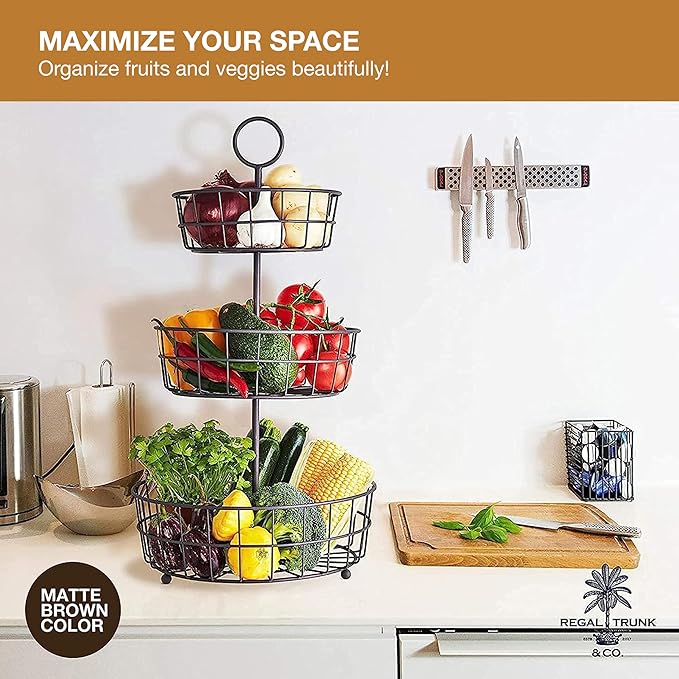 REGAL TRUNK & CO. 3 Tier Fruit Basket, Elegant French Country Wire Baskets, Three Tiered Wire Basket Stand for Vegetables, Bread & More for Countertop or Hanging, Christmas or Birthday Present
