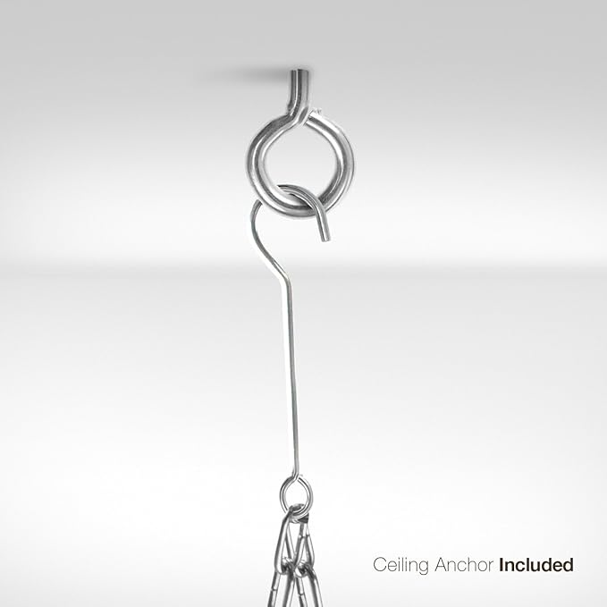 - EASY TO ASSEMBLE — Minimal assembly required with quick set-up — Package includes grid rack with 2 hanging chains, 10 pot hooks, and mounting hardware — Made of metal with powder-coated finish — Beautiful oval frame for stylish look — Complements most light fixtures, appliances, cookware, and design interiors — Measures approximately 31.50" L X 16.50" W X 21" H