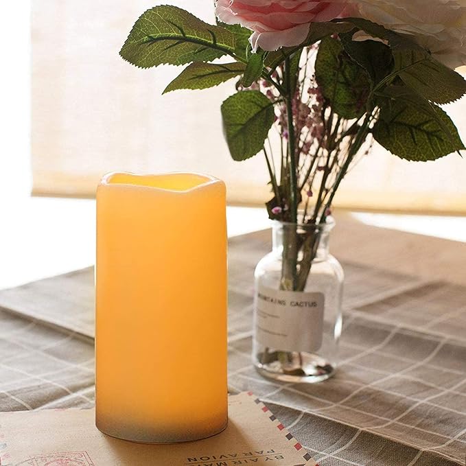 - Realistic Flickering Flame Effect: Featuring an amber yellow light that mimics the natural flicker of a real flame and an ivory shell that resembles traditional pillar candles, these flameless candles create a lifelike ambiance. The heat-resistant design ensures they won’t melt, providing a safe alternative to real candles