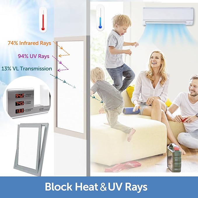 - SUN UV BLOCKING & HEAT CONTROL: Sun blocking window film can block 94% harmful UV rays and 74% infrared rays(Solar heat), and can also prevent your family's skin from aging and furniture from fading. Frosted window film insulates heat in the summer and keeps it warm in the winter, helping to reduce air conditioning costs and save money.