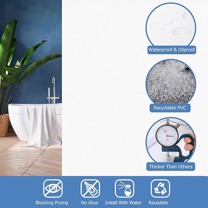 - ECONOMICAL & WIDE APPLICATION: No more heavy and troublesome curtains and blinds, simple decorative window film makes life more convenient and better. Suitable for all smooth and clean glass surfaces in office, bedroom, bathroom, living room, kitchen, balconie, cabinet, glass door, hotel, etc. Double-layered glass, frosted glass and other treated uneven glass is not applicable for window frosting film.