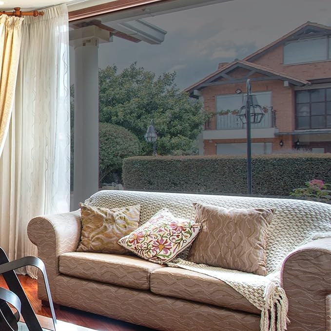 - SUN BLOCKING & ANTI UV: Sun blocking window film can block 93% of harmful UV rays and 75% of infrared rays, preventing people's skin from aging and furniture from fading. 14% light transmission can effectively reduce glare and allow soft natural light to enter the room. Allowing you to maintain youthful skin while having privacy and a natural view. ❗ Black color can only be displayed from the inside and only silver can be seen from the outside. ❗