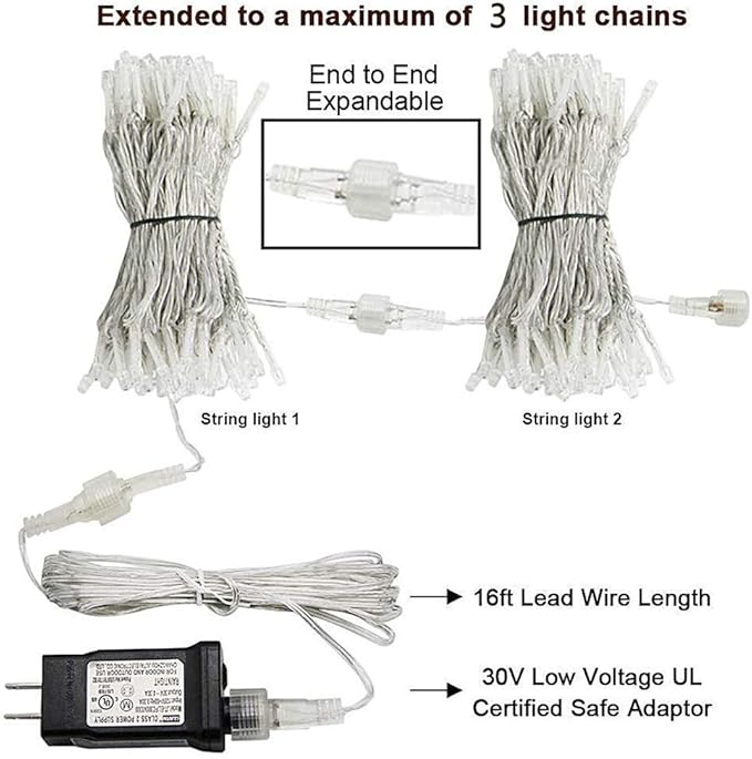 - Length description:9.8ft*9.8ft,with 304LED twinkle bulbs; spacing between every LED: 15cm/6in;It can meanwhile connect of 3 curtain lights;and the12ft lead wire length is enough for you to decorate the place where you want.