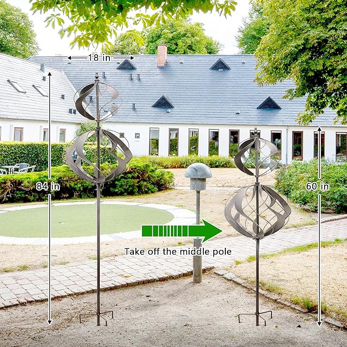 - 【Elegant Dual-Globe Garden Spinner】This eye-catching steel gray color spinner features two gracefully layered globes that reflect sunlight beautifully. With durable bearing, ensuring it spin quietly and smoothly in breeze. Its timeless kinetic design create a relaxing motion that delights viewers.