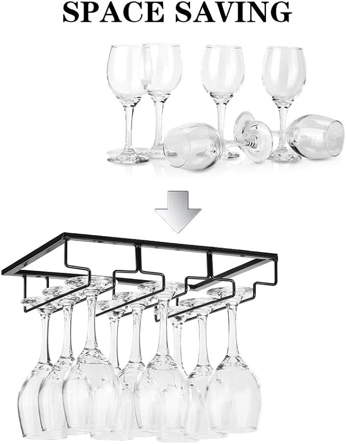 - ๐ทSPACE SAVING: Offer you a neat and modern style kitchen, cabinet or mini bar. Our wine glass rack use the space under your cabinet as storage of your wine glasses, which takes little space.