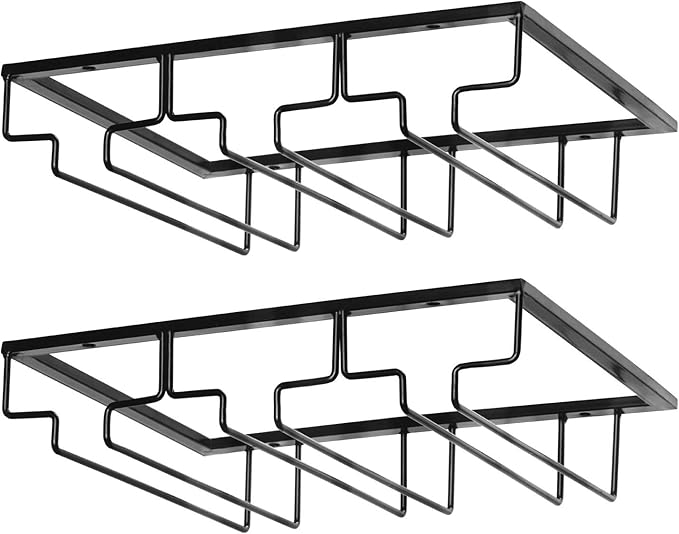 Wine Glass Rack - Under Cabinet Stemware Wine Glass Holder Glasses Storage Hanger 2 Pack Metal Organizer for Bar Kitchen Black