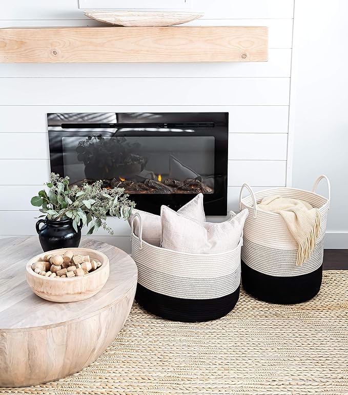 OrganiHaus Black & White Blanket Storage Basket for Living Room 15x18, Woven Nursery Hamper Basket, Large Toy Basket Storage for Kids, Laundry Hamper, Baby Laundry Basket, Cute Cotton Rope Basket