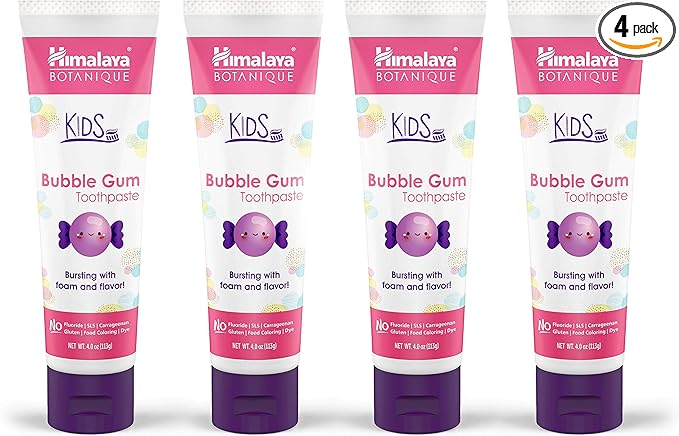 Himalaya Botanique Kids Toothpaste, Herbal, Bubble Gum Flavor, Fluoride-Free, Gentle, No Artificial Flavors or Colors, SLS Free, Gluten Free, Cruelty Free, Vegan, Foaming, 4 Oz, 4 Pack