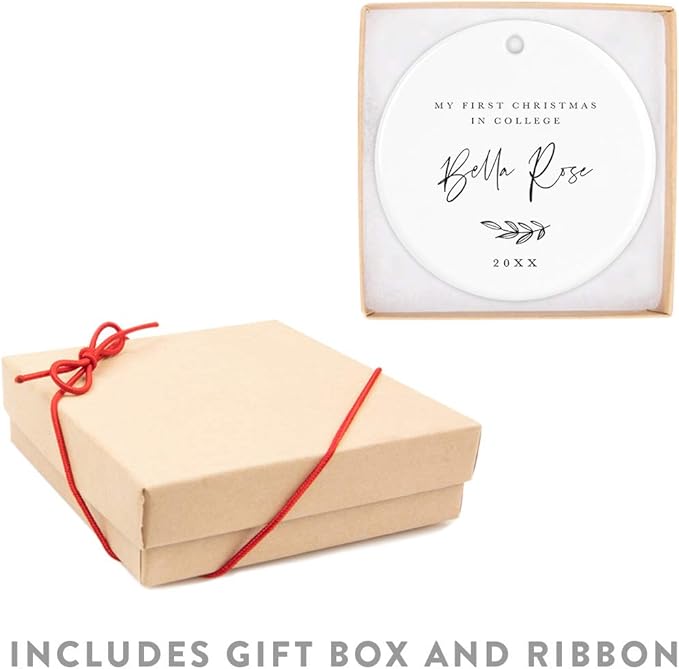 Andaz Press Personalized Round Ceramic Porcelain Christmas Tree Ornament Keepsake Collectible Gift, My First Christmas in College 2025, Olivia Carter, Antique Handdrawn, 1-Pack, Custom