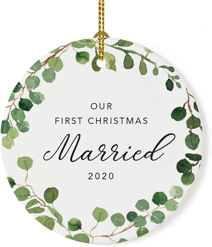 Andaz Press Custom Year Round Ceramic Porcelain Christmas Tree Ornament Keepsake Collectible Gift, Our First Christmas Married 2025, Farmhouse Eucalyptus Wreath, 1-PackCouple