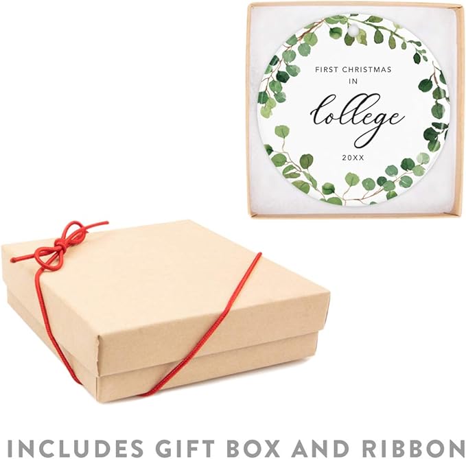 Andaz Press Custom Year Round Ceramic Porcelain Christmas Tree Ornament Keepsake Collectible Gift, First Christmas in College 2025, Farmhouse Eucalyptus Wreath, 1-PackGraduation Gift Ideas