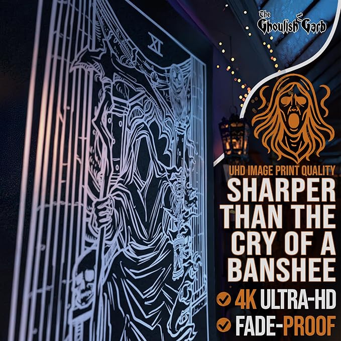 - โณ Features a Monochromatic, Ghoulish Rendition of the Major Arcana Tarot Card, Justice