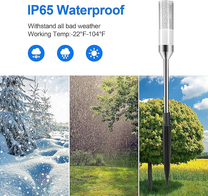- Hight Quality Aluminum Metal, IP65 Waterproof: Are you still worried that stainless steel path lights will rust or the battery-powered solar pathway lights not working or not getting dimmer? If yes, our pathway lights can keep away from these problem. Made of high quality Aluminum Metal, these garden light are IP65 waterproof, which enables to withstand snow, rain, sunlight, most apply to outdoors.