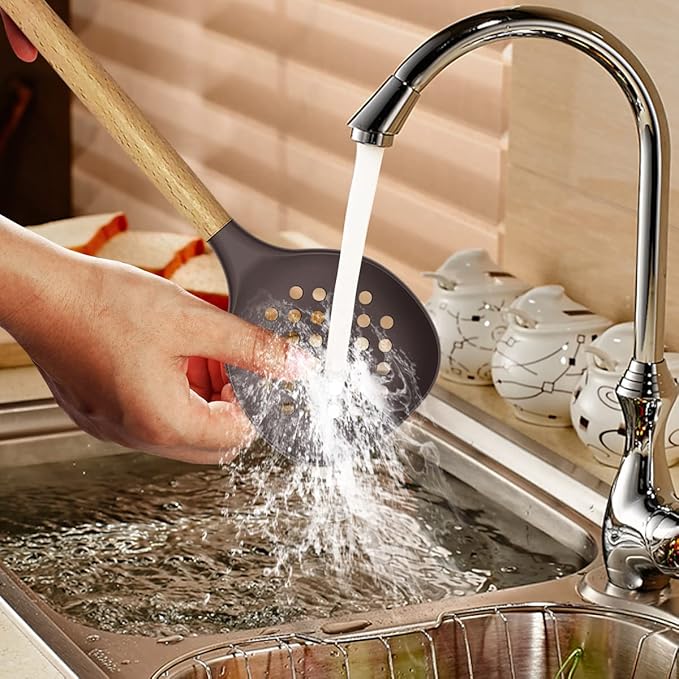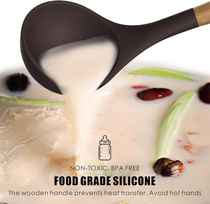 - IDEAL GIFT FOR COOKS – This silicone kitchen utensils set is stylish and practical, fitting various kitchen styles. Perfect for weddings, housewarmings or birthdays as a thoughtful gift. The wooden handle’s shape and temperature ensure comfortable grip, with sleek silicone design blending utility and decor, bringing joy to cooking enthusiasts