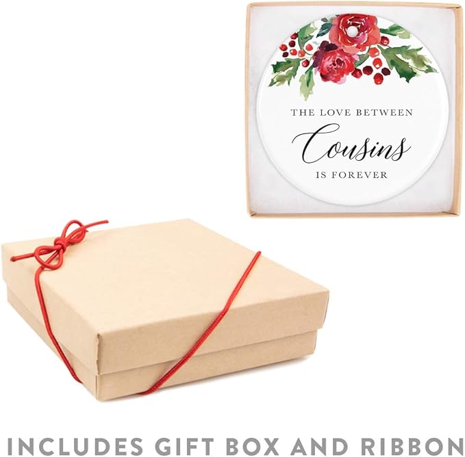 - INCLUDES: 1 round ceramic porcelain ornament designed by Andaz Press, 1 gold cord ribbon, 1 gift box. Celebrate Cousin Love: This cousin ornament 2024 symbolizes the special bond between cousins; a heartfelt christmas ornament cousin that makes a meaningful addition to holiday décor and a keepsake for loved ones