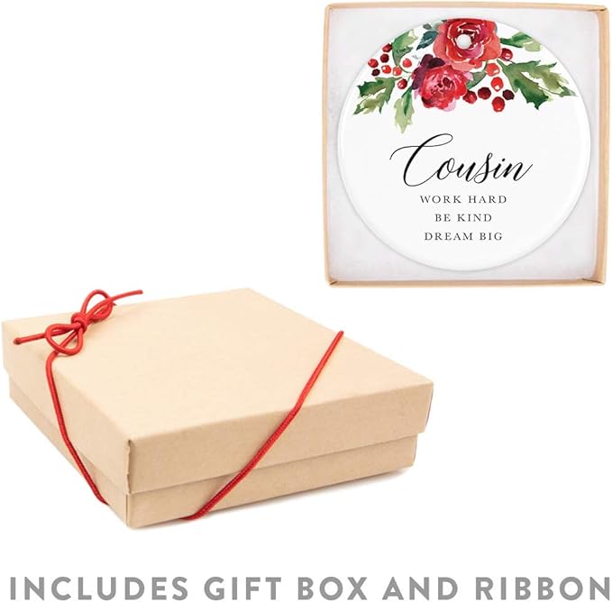 Andaz Press Round Ceramic Porcelain Christmas Tree Ornament Keepsake Gift for Cousins, Cousin Work Hard Be Kind Dream Big, 1-Pack, Includes Ribbon and Gift Box
