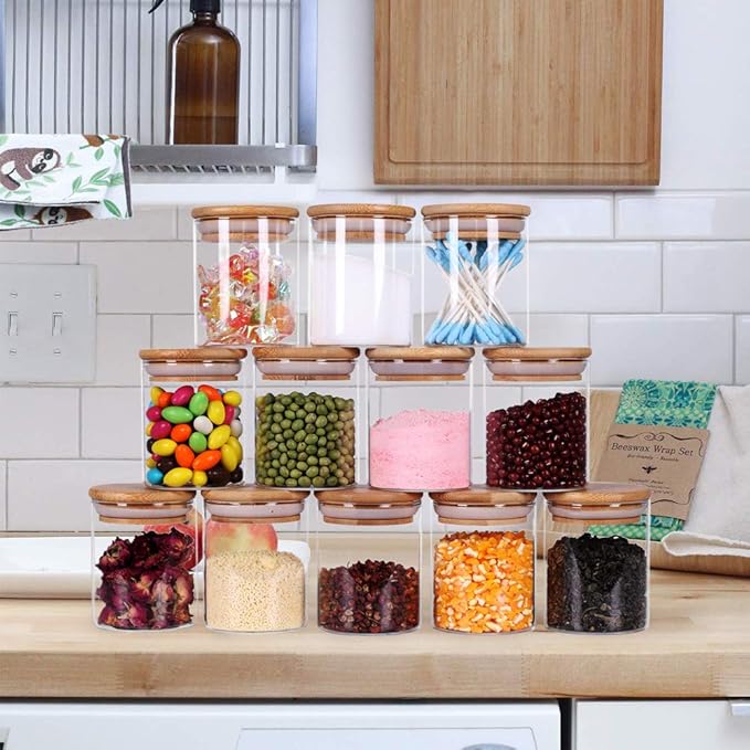 - 【DURABLE】These cute glass containers are thicker than other jars.There is a silicone ring on the bamboo lid that will not make a sound and scratch the jar when the lid is opened.I think the wooden lid is more environmentally friendly and healthy.