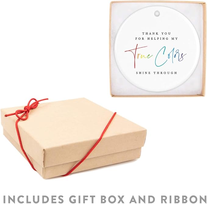 Andaz Press Round Ceramic Porcelain Christmas Tree Ornament for Teacher Thank You Appreciation Graduation Gift, Thank You for Heling My True Colors Shine Through, Rainbow Graphic, 1-Pack