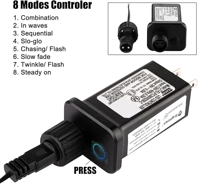 - End to end extendable: Maximum connectable 6 strands to customize your need for large area and festival decorations, 5.9 inches tail cord with key designed female connector for quick and easy connection 8 fantastic flashing modes: Press the press button on ac adapter repeatedly to select 1. combination, 2. in waves, 3. sequential, 4. slow glow, 5. chasing or flash, 6. slow fade, 7 .twinkle or flash or 8. steady on working mode