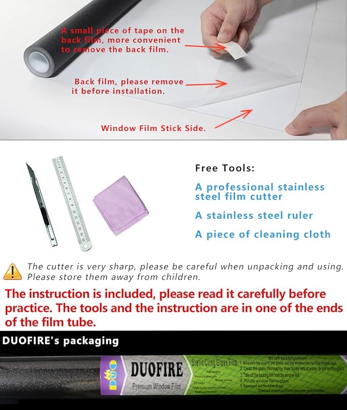 - Easy to Install: The black out windows film adopts electrostatic adsorption design, making it easier to install and remove, leaving no residue and no damage to the window. Window film can be cut to any size according to needs and is suitable for many places. To effectively install window film, read the instructions carefully. The window film contains instructions and professional tools (stainless steel film cutter, stainless steel ruler, cleaning cloth).