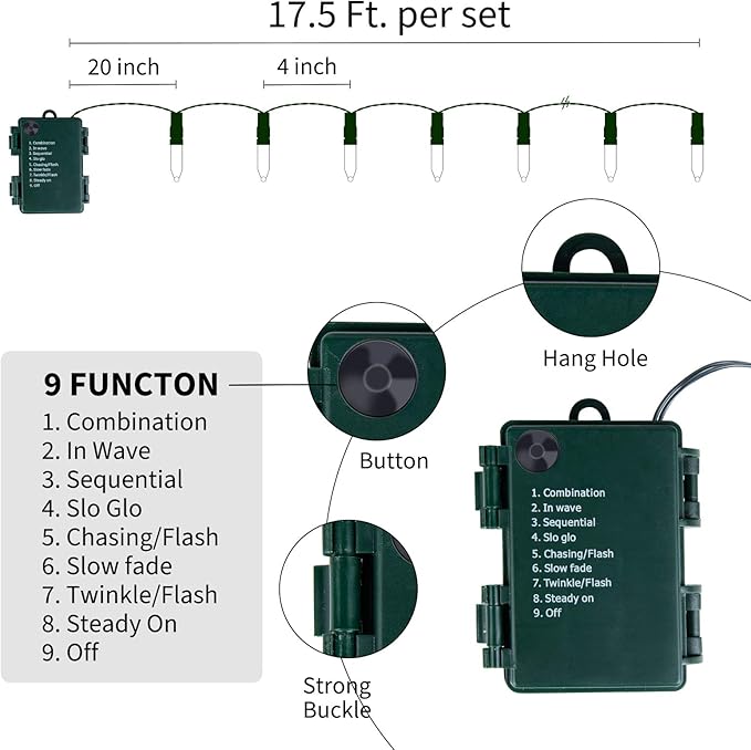- 【Battery operated】3 AA batteries (Not included) operated, 2 pack 18 feet 50 mini LED strands, 3.94 inch lights spacing with compact water resistant battery control box, energy saving and eco-friendly. Operation time depends on the running time and the quality of installed battery