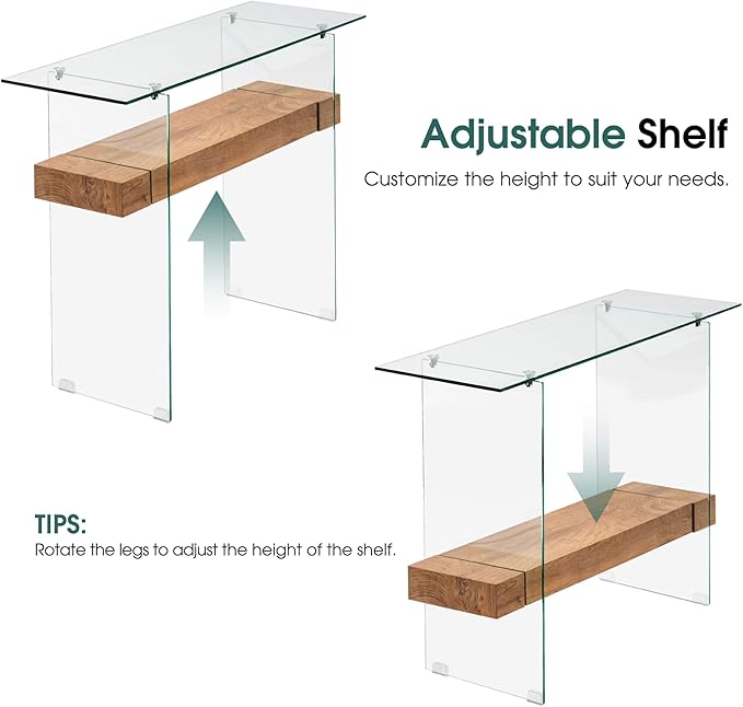 - Modern Air Console Table: Crafted with tempered glass supports and faux wood, this small entryway table creates a mesmerizing floating illusion that visually expands small spaces. The transparent base enhances natural light flow, brightening tight entryways or narrow hallways
