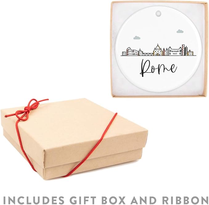 Andaz Press Round Ceramic Porcelain Christmas Tree Ornament Keepsake Gift, Rome, Colorful International City Skyline Graphic, 1-Pack, Birthday Ideas Family Coworker Him Her, Gift Box