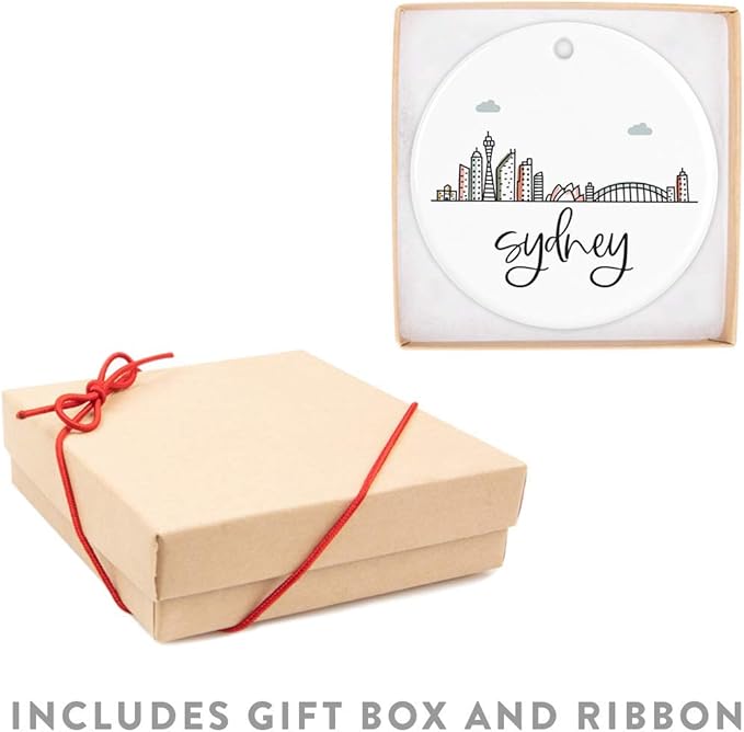 Andaz Press Round Ceramic Porcelain Christmas Tree Ornament Keepsake Gift, Sydney, Colorful International City Skyline Graphic, 1-Pack, Birthday Ideas Family Coworker Him Her, Gift Box