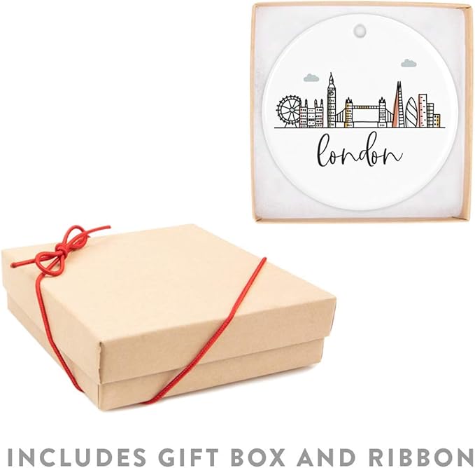 Andaz Press Round Ceramic Porcelain Christmas Tree Ornament Keepsake Gift, London, Colorful International City Skyline Graphic, 1-Pack, Birthday Ideas Family Coworker Him Her, Gift Box