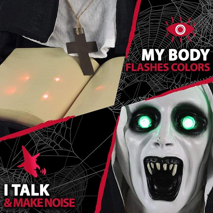Haunted Hill Farm Life-Size Scary Talking Witch Nun Halloween Animatronic with Touch Activated Lights and Sound, Poseable, Battery Operated Indoor or Covered Outdoor Creepy Halloween Decorations