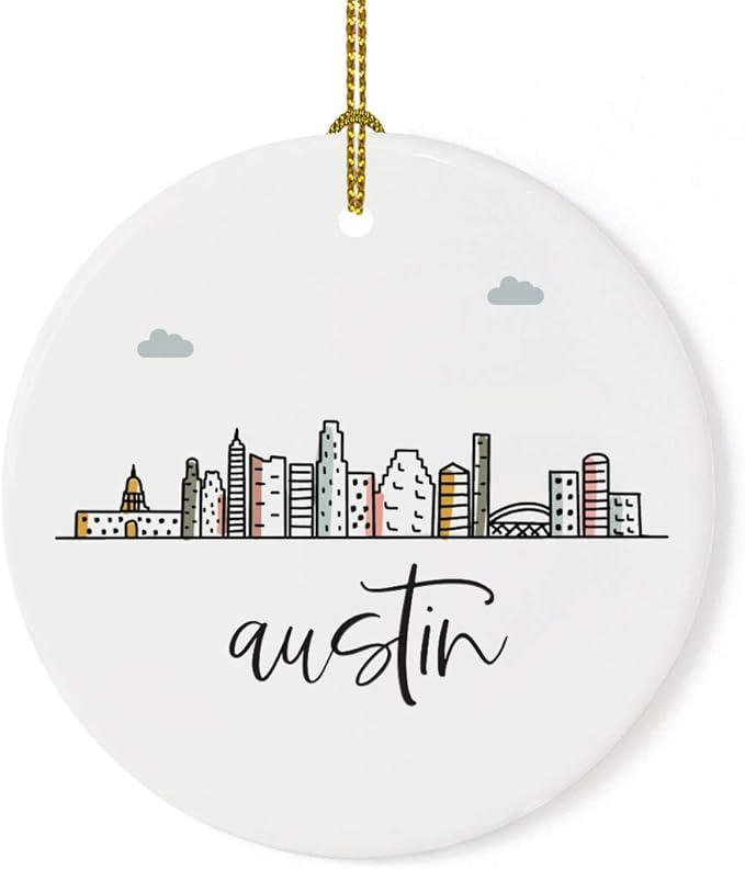 Andaz Press Round Ceramic Porcelain Christmas Tree Ornament Keepsake, Austin Colorful City Skyline Graphic, 1-Pack, Birthday Gift Ideas Family Coworker Him Her, Includes Gift Box