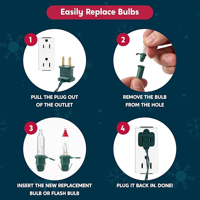 - INDEPENDENT CIRCUIT & REPLACEMENT BULBS - Enjoy a hassle-free holiday! Our lights feature an independent circuit system; if one bulb burns out, the rest stay lit. The set includes 6 spare bulbs, 2 replacement fuse, and 6 test flash bulbs., ensuring your display stays bright throughout the season without needing a full replacement.