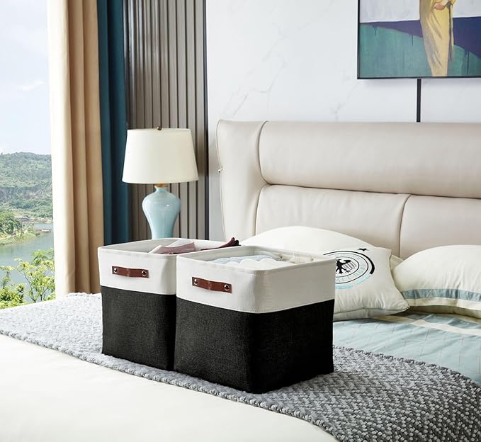- Durable Cubes Design: DECOMOMO's storage bins feature a sturdy metal frame, extra thick EVA exterior, polyester interior, 2.5mm MDF fiberboard bottom, and faux leather handles capable of holding up to 25 lbs.