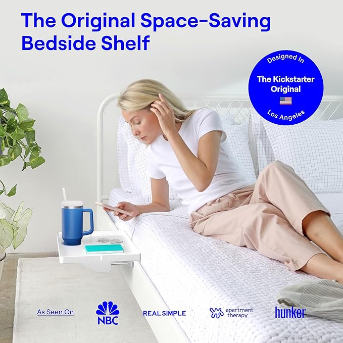 - ORIGINAL, TRIED & TRUE DESIGN: Launched from Kickstarter and designed in Los Angeles, the BedShelfie bedside shelf has been featured on top publications such as Apartment Therapy, BuzzFeed, and Real Simple. Our original bed shelfie bed shelf organizer table helps small space dwellers make the most out of their space, from those in tiny bedrooms to college students in need of a top bunk bedside table. It is the preferred choice for bed side organization and storage.