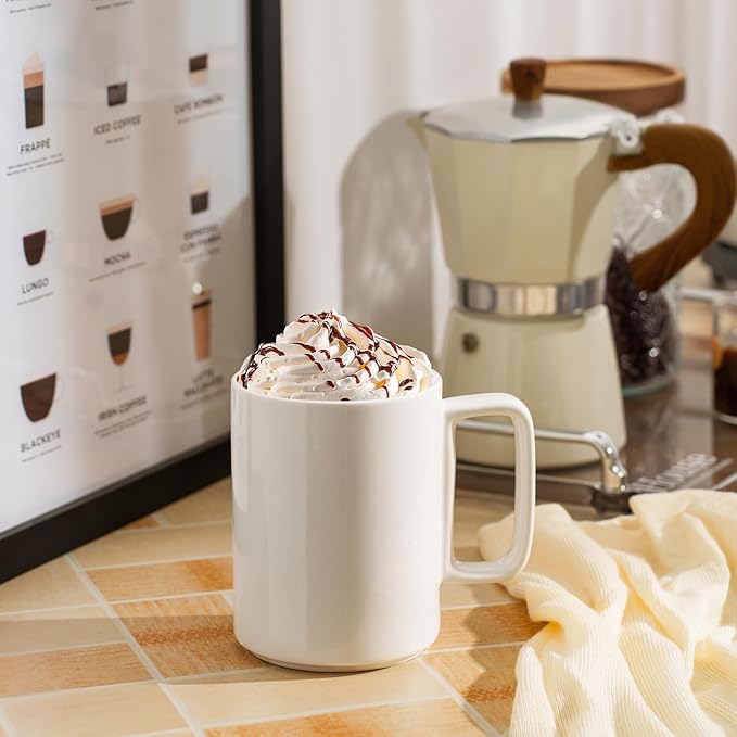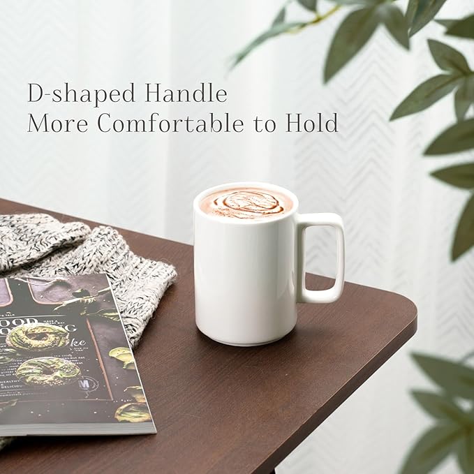 - SIMPLE, COMFORTABLE DESIGN: The Clean-lined Design in white porcelain is ideal for everyday enjoyment of your favorite hot pick-me-up. 15 Ounces capacity is perfect for tea, coffee or hot chocolate