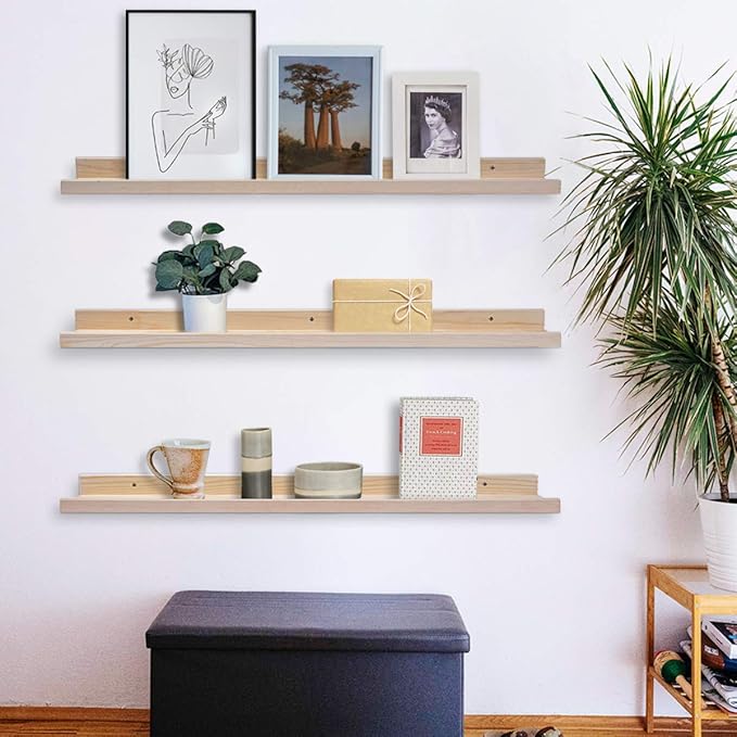 - Rustic Wood Shelves :Wall shelves is made of natural wood, Healthy and tasteless,They are sturdy enough to hold your favorite collections, family photos(as picture ledge shelf), Kid books, decorative items,cosmetics or plants.