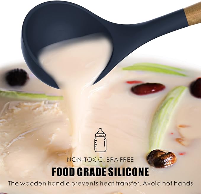 Silicone Cooking Utensils Set - 446°F Heat Resistant Silicone Kitchen Utensils for Cooking,Kitchen Utensil Spatula Set w Wooden Handles and Holder, BPA FREE Gadgets for Non-Stick Cookware (Navy Blue)