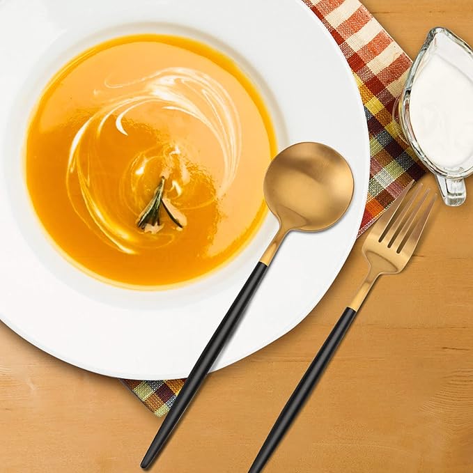 - ★ Superior stainless steel silverware set--The gold flatware set with black handle is made out of 18/0 Stainless Steel that it is not easy to corroding, flexing. The fork spoon knife set with a finely polished satin finish and has a reliable, sturdy construction for an exceptional comfort in use. The black handle is made by the same process of non stick pot, which is not easy to fall off.