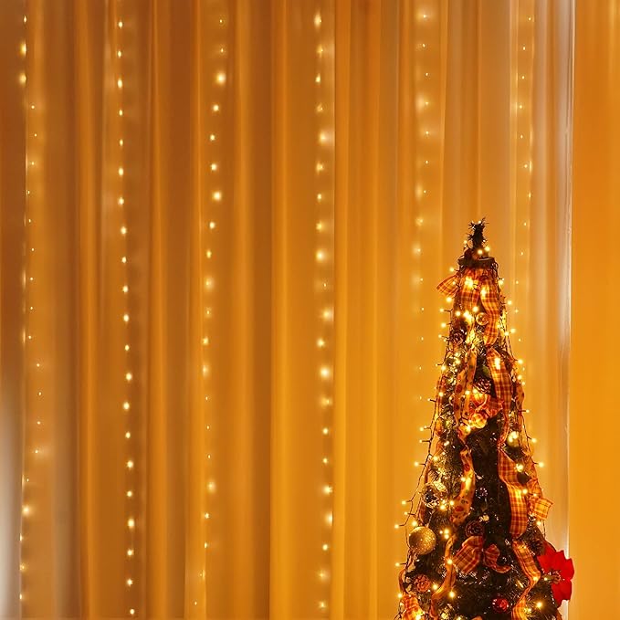 Dazzle Bright Curtain String Lights, 300 LED 9.8ft x9.8ft Warm White Fairy Lights with 8 Lighting Modes, Waterproof Lights for Bedroom Christmas Party Wedding Home Garden Wall Decor