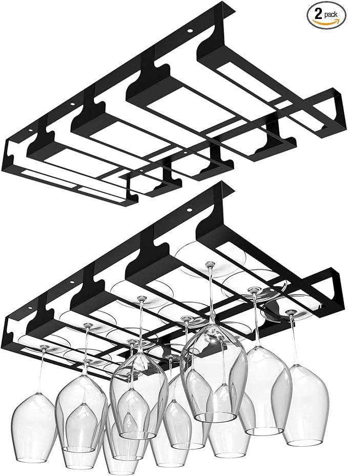 Wine Glass Rack - Under Cabinet Stemware Wine Glass Holder Glasses Storage Hanger Metal Hanging Organizer for Bar Kitchen, Black 4 Rows 2 Packs